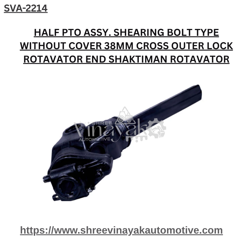 This half PTO (power take‑off) assembly is designed specifically for the rotavator end of Shaktiman machines which use a 38 mm cross section shaft with an outer‑lock coupling system. The “shearing bolt type” means a bolt is incorporated to act as a fail‑safe: if the PTO encounters an overload or obstruction, the shearing bolt will fail first, protecting more expensive components downstream. The “without cover” version means the assembly does not include the protective cover/guard, so the user should ensure safety measures or a separate guard are in place.