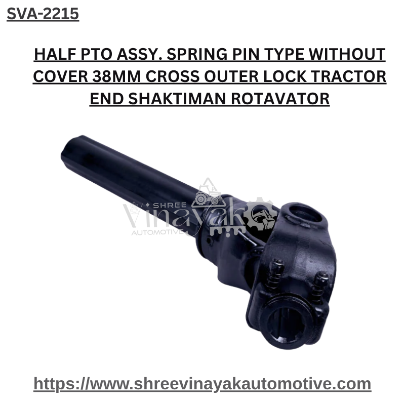 This is a half PTO (Power Take‑Off) assembly designed for the tractor end of a Shaktiman rotavator drive train, specified for a 38 mm cross (1210 cross) shaft with an outer‑lock style coupling. The “spring‑pin type” indicates that the assembly uses a spring‑pin as a sacrificial or overload‑protection mechanism: under an overload or obstruction, the pin will disengage or shear to protect more expensive drivetrain components ahead of it. This version is delivered without the protective cover/guard, so it’s intended for use where the cover is already present or a separate guarding arrangement is in place.