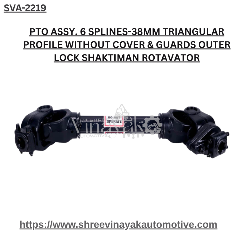 The PTO Assembly for Shaktiman Rotavators is designed with a 6-spline, 38mm triangular profile for reliable power transmission. This part does not include protective covers or guards, making it suitable for applications where these components are not required. The assembly features an outer lock to ensure secure attachment during operation. It is engineered to fit Shaktiman rotavators, facilitating efficient performance by transferring power from the tractor to the rotavator with precision. Ideal for replacements or repairs, this PTO assembly ensures durability and smooth functioning in heavy-duty farming tasks.